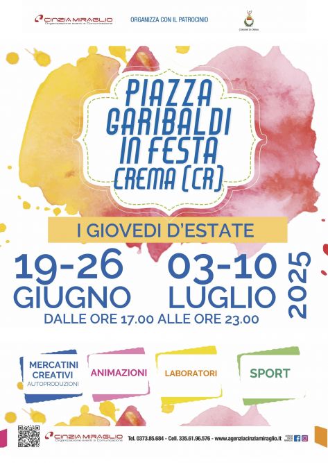 Per quattro giovedì si terrà PIAZZA GARIBALDI IN FESTA!Gli obiettivi sono quelli di promuovere la socialità, offrire un modo gioioso di vivere la bellissima Piazza Garibaldi e promuovere le attività locali con diverse iniziative: