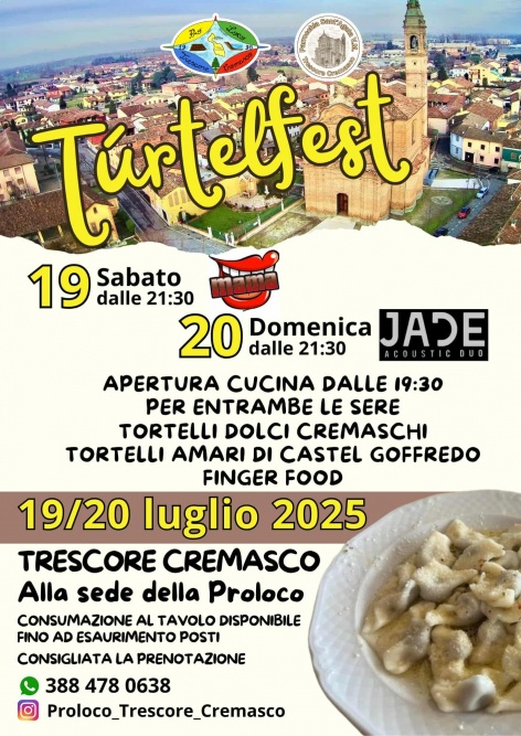 La proloco di Trescore Cremasco in collaborazione con il bar in piazza di Cinzia Grazioli, la parrocchia di Trescore Cremasco, auser e comune di Trescore Cremasco, sono lieti di regalarvi un nuovo evento: TÚRTELFEST.Due serate di buon cibo e bella musica in piazza della chiesa.